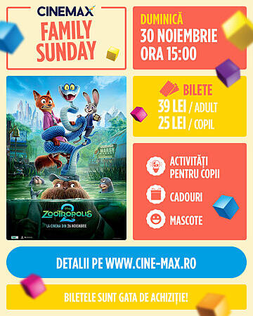 Pregătește-te pentru o duminică plină de activități, zâmbete și voie bună la Family Sunday – Zootropolis 2, evenimentul dedicat celor mici și celor mari, care aduce aventura filmului, entuziasmul jocului și bucuria cadourilor în același loc! Ce te așteaptă: Înainte de proiecția filmului Zootopia…