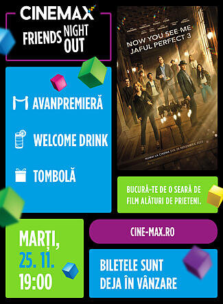 Pe 25 noiembrie, te invităm la o seară dedicată prietenilor, iluziilor și filmului! Planificăm atmosferă plină de vibe cu cocktailuri din partea casei, vouchere și cadouri de la Trapped Escape Room & The Funny Brand, plus proiecția în avanpremieră a unuia dintre cele mai așteptate filme Despre film Now You See Me: Jaful Perfect 3 îi aduce din nou pe marile ecrane pe Cei Patru…