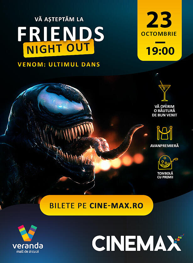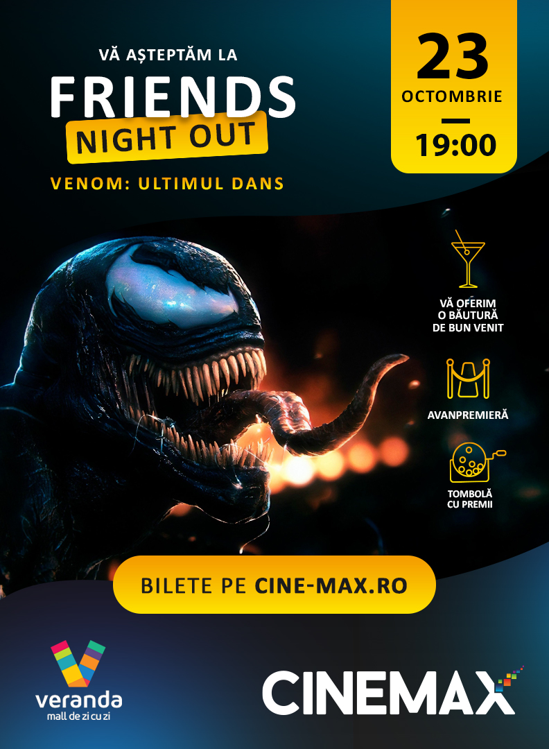 Îți e dor de o seară memorabilă cu prietenii? Atunci vino cu gașca pe 23 octombrie, la ora 19:00, la CINEMAX Veranda! Te așteaptă o seară plină de distracție, acțiune și multe surprize: FRIENDS NIGHT OUT.