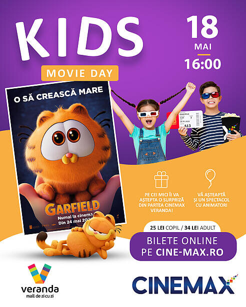 Pe 18 mai, la ora 16:00, vă așteptăm la o zi dedicată copiilor, cu un spectacol de animatori distractiv și proiecția filmului Garfield, care va stârni hohote de râs printre cei mici.